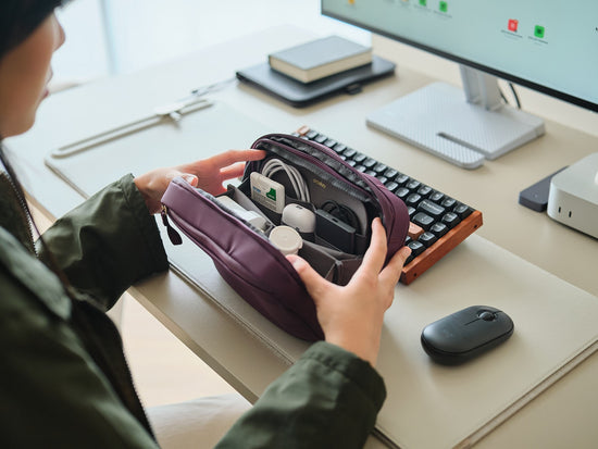 The magnetic cable holder can be moved anywhere along the toolbar of the Orbitkey Desk Mat to keep your cable in place and always within reach. No more tangles or cables falling off the table!